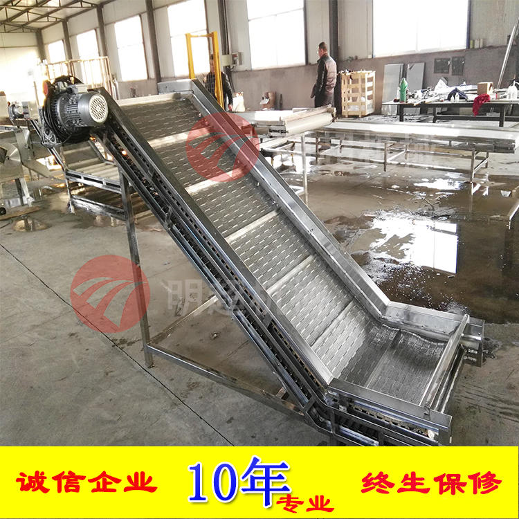 該機采用雙層進行輸送,上面一層采用pvc輸送,當蔬菜輸送到中間之后,通過強制分離裝置,分離到切菜機入口,當蔬菜從切菜機入口進入到里面,切完后再通過底層的第二層不銹鋼網帶輸送提升到下一工序,運行速度可調。